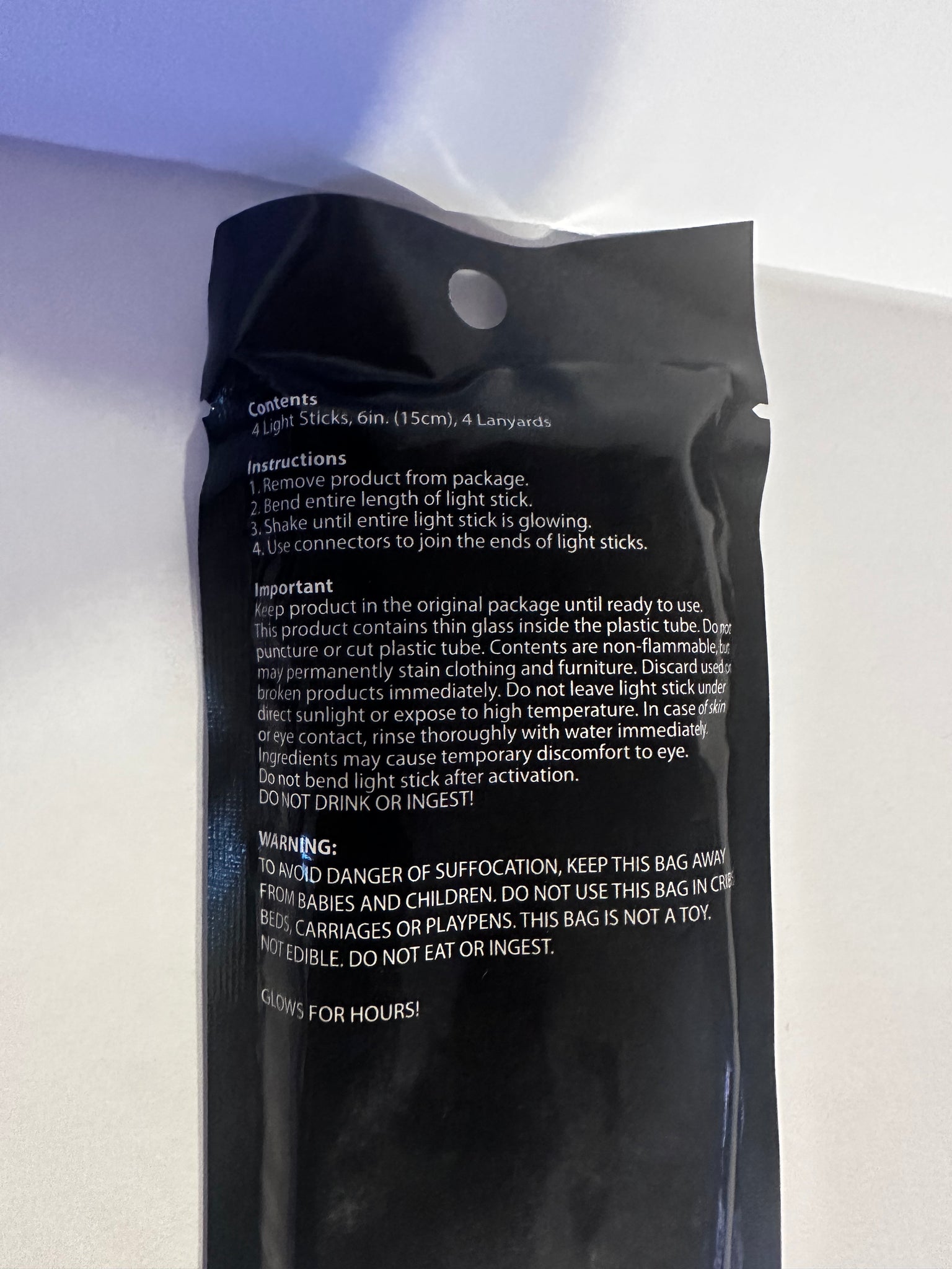 - Includes 4 glow sticks, four plastic connectors, and four lanyards