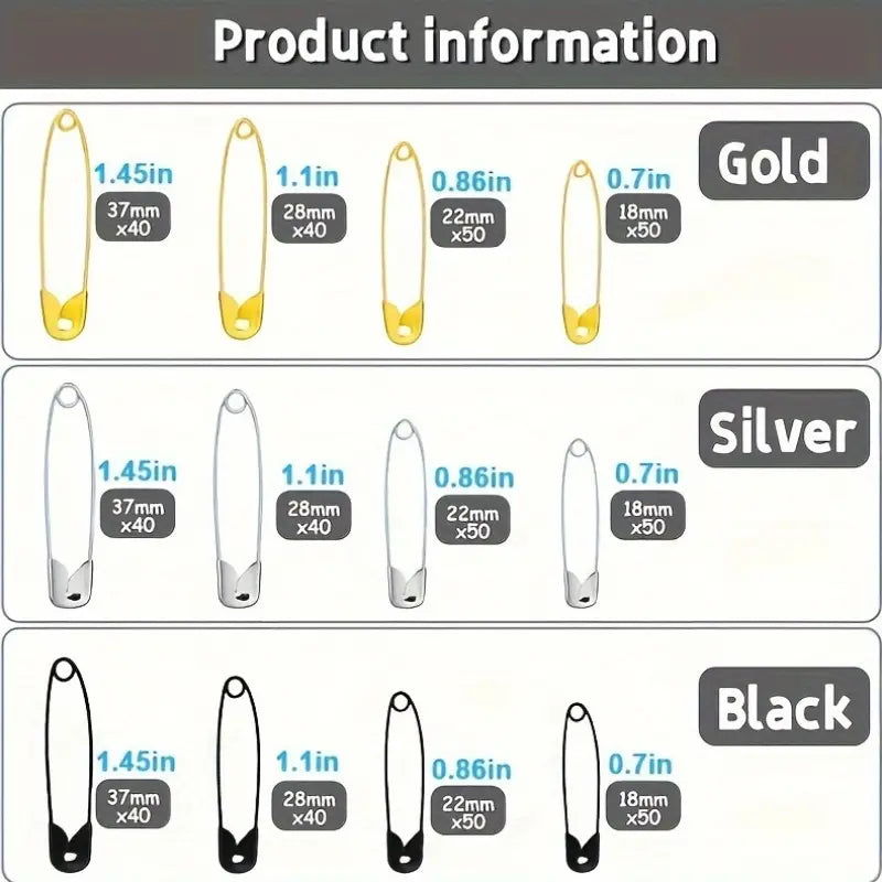 Safety Pins Set - Heavy Duty Nickle Plated Rust Resistant Metal Pins for Clothing, Crafts, and Dressmaking - Assorted Sizes in Three Colors - Weaving Loom Tools & Accessories Without Battery