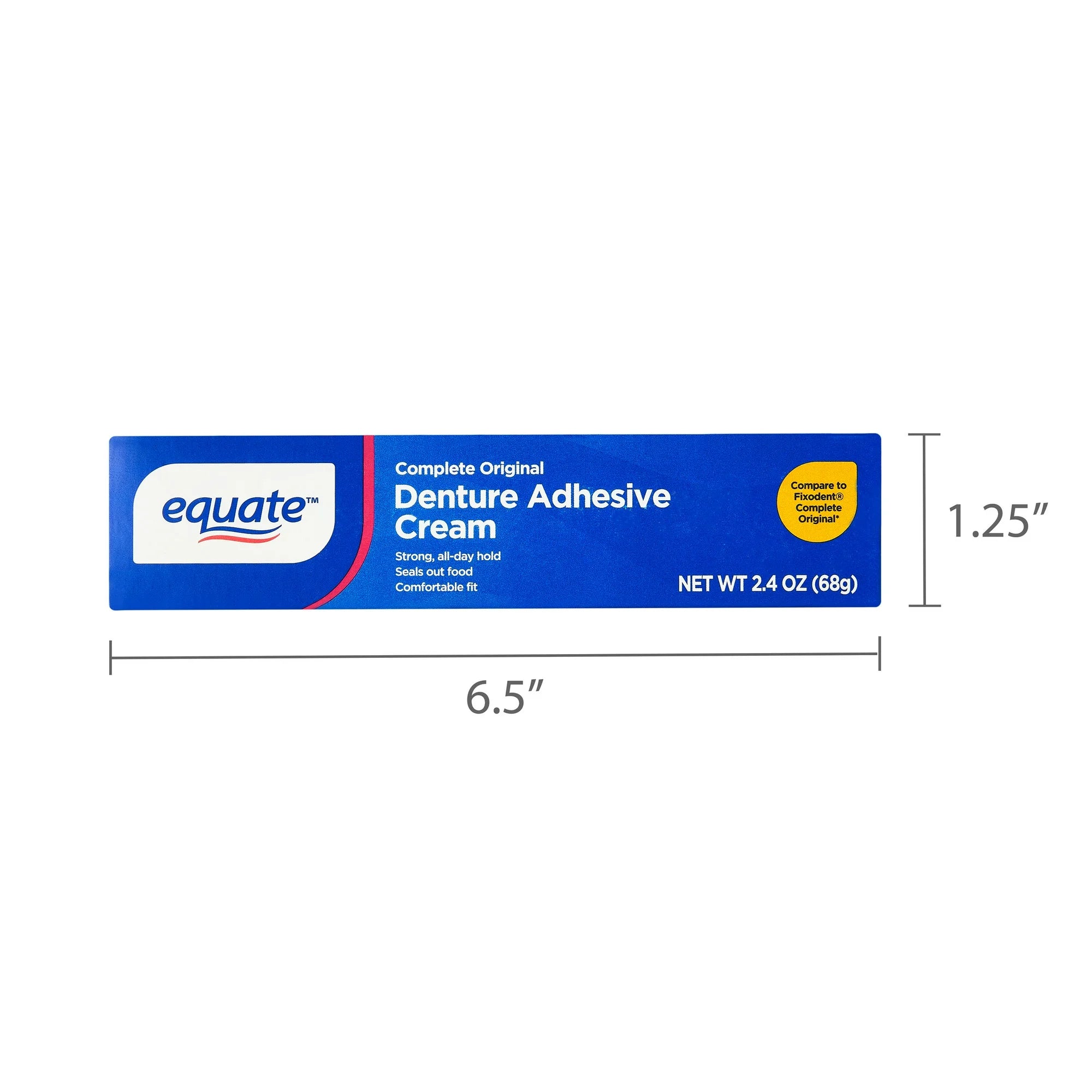 For a confident smile and fresh breath use Equate Denture Adhesive Cream for a firm hold.Whether at work, play, eating or drinking this laboratory tested and approved adhesive will provide a firm and long lasting hold Equate Denture Adhesive Cream is laboratory developed and tested adhesive that will keep your dentures tight developed to use the moisture in your mouth to form an airtight seal that will keep your dentures firmly in place safe on dentures, natural teeth and gums To apply, clean and dry out your dentures; apply the adhesive in short strips, not too close to the denture edges; rinse your mouth, and press your dentures firmly in place. Don't let your dentures get in the way of living your best life -smile with confidence with Equate Complete Original Denture Adhesive Cream.